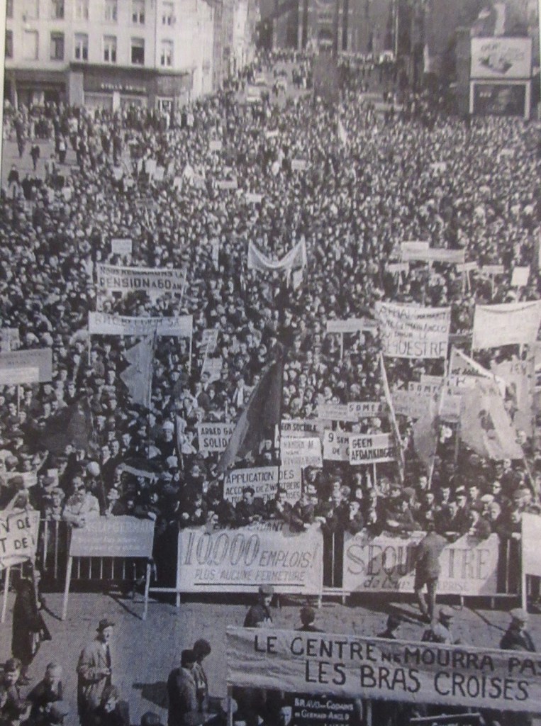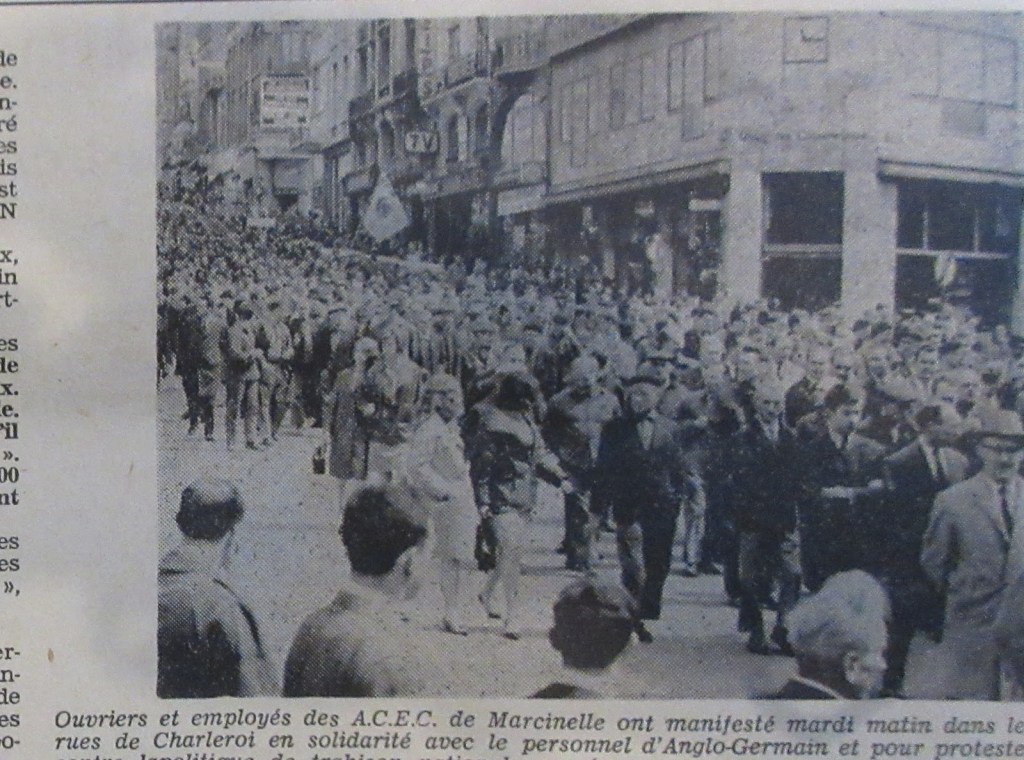 Durant la 2ème semaine, dès le lundi 22 mai, le mouvement s’élargit, c’est d’abord une grève générale de 24 h des métallos du Centre, avec une manifestation devant l’Anglo-Germain :15 à 20 000 travailleurs défilent devant l’usine occupée. « On ne crie pas, mais un chant s’élève inlassablement, l’Internationale. Des drapeaux noirs comme celui fiché sur l’usine sont portés par les travailleurs mais aussi d’innombrables drapeaux jaunes avec un coq rouge comme en 60-61. Pendant plus de 45 minutes, le flot des manifestants défile. Les trains Bruxelles – La Louvière sont bloqués pendant plus d’une 1/2 heure. Des pancartes réclament : « halte aux faux reclassements, mise sous séquestre » L’après-midi, ce sont les mères, épouses et fiancées des occupants qui parcourent les rues de La Louvière portant des drapeaux noirs et des calicots réclamant du travail pour leur mari et le sauvetage de la Wallonie. Le mercredi 24, c’est toute la métallurgie du Hainaut, suivie par celle de Liège et de Namur, qui arrête le travail pendant une heure. Une entreprise liégeoise Bailly Mathot, menacée de fermeture elle aussi, démarre une occupation. Les jours suivants, les entreprises métallurgiques tiennent assemblée. Dans certaines, on vote des résolutions appelant à la vigilance : « Si les promesses de reclassement ne sont pas tenues, il faudrait généraliser les occupations d’usine. » La situation devenait explosive en cette fin mai 1967.