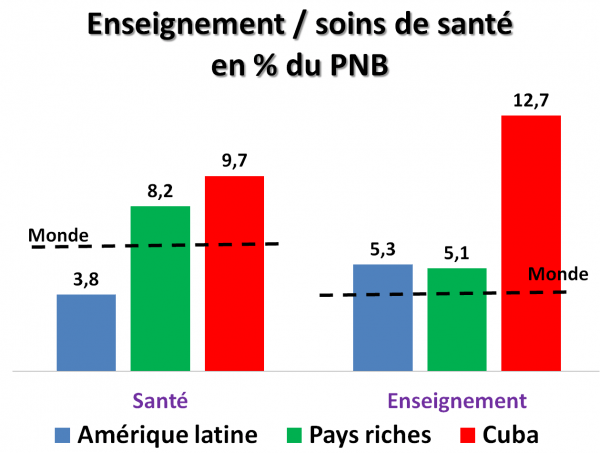 ” Cuba est internationalement reconnue pour ses réalisations dans les domaines de la santé et de l’éducation, avec un service social qui surpasse celui de la plupart des pays en développement et dans certains secteurs par rapport à celui des pays les plus développés. Depuis la révolution cubaine de 1959 et la mise en place d’un gouvernement communiste à parti unique, le pays a créé un système de services sociaux garantissant un accès total à l’éducation et à la santé, assurés par le pays.