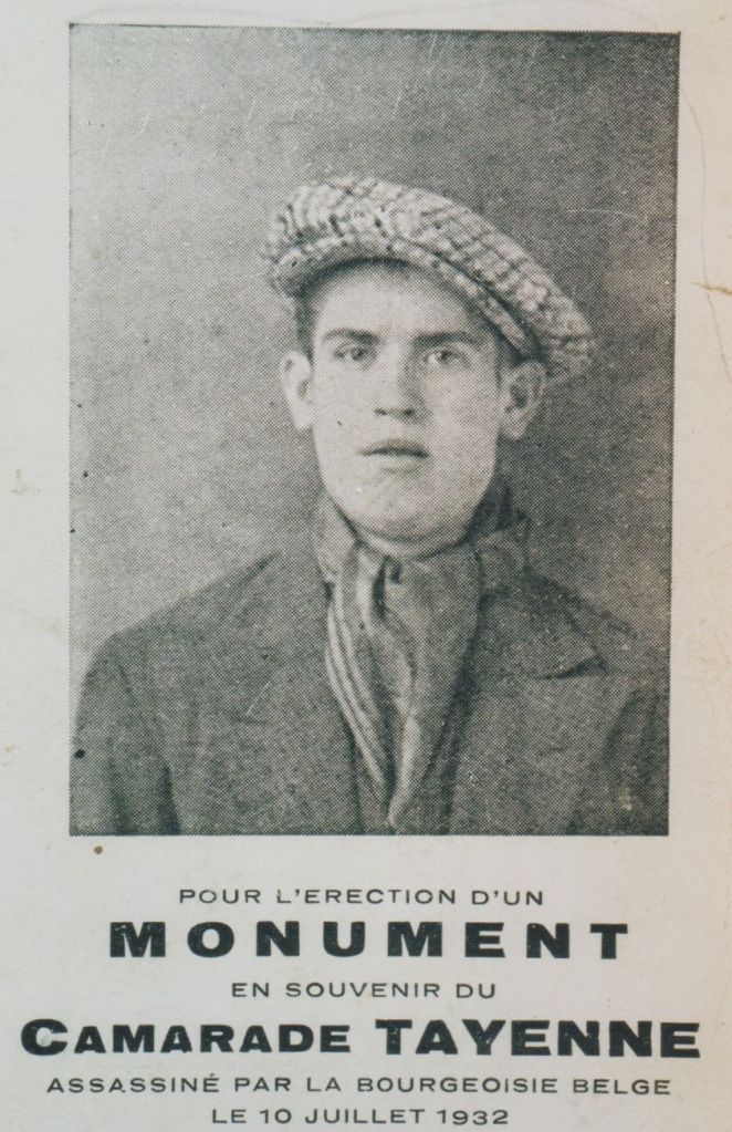 L’histoire de cette grève est le sujet d’un film muet, Misère au Borinage (1934, voir ici sur youtube), réalisé par Henri Storck et Joris Ivens. Ce documentaire social, réalisé dans une semi-clandestinité, est devenu aujourd’hui une référence cinématographique et historique incontournable. Moins connu est le documentaire Manifestation pour Tayenne – l’ouvrier abattu par la gendarmerie lors de ces grèves. Tourné en 16mm, en 1933 par Van Ommeslaeghe et Jean Fonteyne, qui avaient participé à la réalisation de Misère au Borinage. Manifestation pour Tayenne est le premier documentaire social de l’histoire du cinéma. Il montre la manifestation organisée par le Secours Rouge pour le premier anniversaire de la mort de Louis Tayenne, d’abord sur les lieux du drame et puis au cimetière.