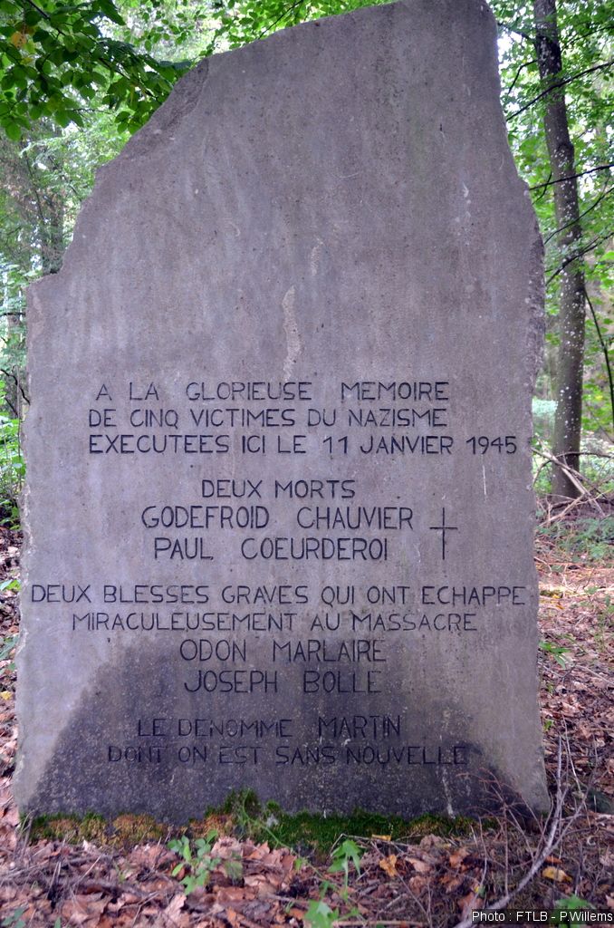 Nous atteignîmes un bois à quelques kilomètres au nord-est de Houffalize et nous y pénétrâmes. Anxieusement, je scrutais les alentours mais déjà nous étions alignés sur un rang. A ma droite se trouvaient l’inconnu et Godefroy Chauvier. Joseph Bolle et Martin Omer étaient à ma gauche.