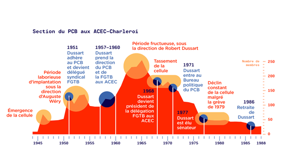 La première cellule des ACEC s’observe précocement dès les années 1930 sur son site de Ruysbroeck (Leeuw-Saint-Pierre, près de Bruxelles), situé dans la zone industrielle de la vallée de la Senne. L’activité militante décolle durant la guerre avec des grèves contre le travail forcé, puis à partir de la Libération avec l’accession du responsable communiste local, Jean Lambert, à la présidence de la délégation syndicale. L’évolution de ce groupe reste mystérieuse mais il semble clair que le nouveau délégué principal se soit concentré sur son mandat syndical et sa propre carrière, aux dépens de sa cellule. L’écartement d’un militant trop zélé en 1952 marque l’arrêt formel de l’activité du PCB dans l’usine. Ruysbroeck se traînera désormais syndicalement aux initiatives des trois autres sites des ACEC et rechignera à rallier la plupart des grèves conjointes. Son désistement avec une large unanimité à la grande grève de 1979 pour les 36 heures par semaine10, malgré des semaines de blocage général, est révélateur du décalage.