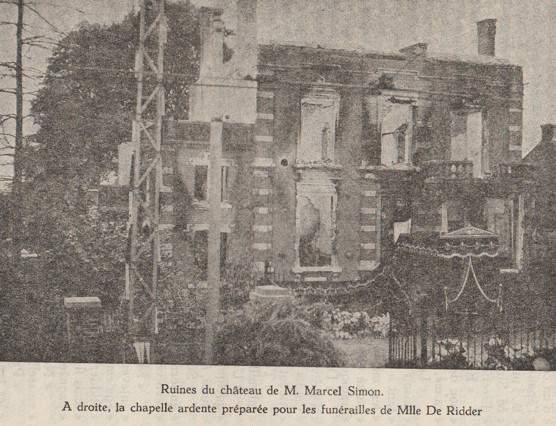 Suite à ce récit de Merlot, les bandits montèrent dans leurs voitures et se rendirent à la rue de la Station n° 30 à Trazegnies, maison de M. Simon. Ils sonnèrent à la grille. Melle De Ridder, gardienne du château* vint leur ouvrir le grillage. Le propriétaire était toutefois absent. L’homme avait appris le meurtre dont avait été victime le bourgmestre rexiste du Grand Charleroi et avait préféré trouver refuge à Bruxelles . Les fascistes entrèrent dans l’immeuble , perquisitionnèrent toute la demeure. Constatant l’absence de l’homme qu’ils recherchaient, ils remontèrent en voiture et se rendirent dans la maison d’Englebin pour rendre un dernier hommage à sa dépouille et celle de son épouse et de son fils. Ils s’en retournèrent alors à Charleroi