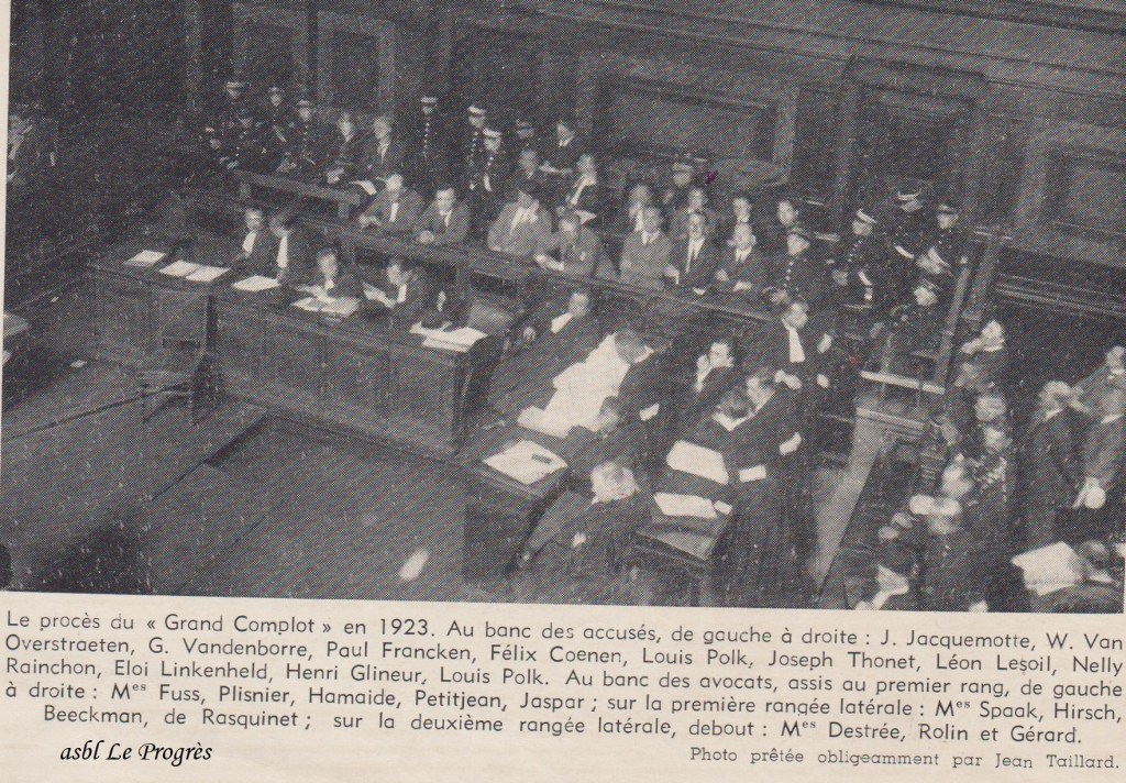 Le procès débute le 8 juillet. L’acte d’accusation est présenté par le procureur général en personne. Bien des ténors du barreau et du Parlement se relaient pour les accabler ou les disculper. À la défense, plusieurs socialistes s’échinent à décharger les prévenus, comme Jules Destrée, Henri Rolin et Paul-Henri Spaak. Le libéral Robert Petitjean, le nationaliste flamand Rik Borginon et l’unique communiste Charles Plisnier s’efforcent de démontrer le caractère légal de l’activité des militants. Les avocats convoquent des témoins, y compris des chefs du POB comme Louis De Brouckère et même Émile Vandervelde qui soulignent combien certains de leurs textes ont été plus subversifs que les brûlots communistes incriminés. L’accusation et la grande presse appuient invariablement le lien entre l’Allemagne et le bolchévisme. Sur un ton cocardier éculé, Le Soir affirme que les communistes travaillent pour « la propagande russo-boche » tandis que La Libre Belgique joue la surenchère contre ces « infâmes traîtres » à la patrie. La germanophobie est alors ravivée par l’occupation militaire de la Ruhr. Le 11 janvier 1923, Français et Belges envahissent cette région allemande très industrielle afin d’accaparer son charbon et son acier pour honorer les fameuses réparations de guerre que la république de Weimar peine à fournir. Cet événement a bien sûr une importance décisive dans cette affaire.