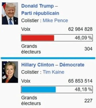 Dans 48 des 50 Etats américains, il y a la règle du vote majoritaire. Le candidat qui a le plus de voix des électeurs d’un Etat a toutes les voix des grands électeurs de cet Etat. C’est la règle du « gagnant prend tout », winner take all en anglais. Et cela crée parfois des surprises. En 2016, la candidate démocrate Hillary Clinton a eu 65 853 516 voix et le candidat républicain Donald Trump a eu 62.984.825 voix. Hillary Clinton a donc eu presque 3 millions de voix en plus que Trump, mais c’est Trump qui a eu la majorité des voix des grands électeurs et qui a été élu président.