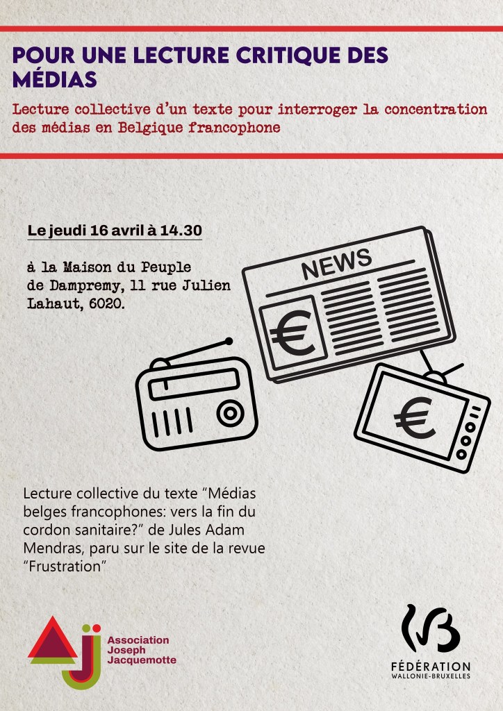Dans un contexte politique et social explosif, l’information est un enjeu démocratique majeur. Mais comment les citoyen.ne.s peuvent-ils s’informer de manière factuelle alors que nombres de médias sont contrôlés par des intérêts éloignés d’un projet d’information objective ? En France, la mainmise de grandes fortunes proches de l’extrême-droite comme Mr Bolloré influence grandement les débats publics, par exemple. L’Italie a joué un rôle précurseur en la matière avec la figure de Silvio Berlusconi. Mais qu’en est-il en Belgique francophone ? Pour entamer un processus de critique des médias, nous vous invitons à un mini-arpentage (une lecture collective et une mise en débat) d’un texte sur cette question: https://frustrationmagazine.fr/medias-belges